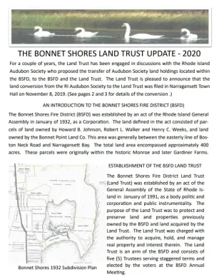 The Bonnet Shore Fire District (BSFD) Land Trust was created by a legislative act of the Rhode Island General Assembly in 1991. The R.I. General Assembly subsequently passed amendments in a second act in 1992. The 1991 act as amended represents the “charter” of the BSFD Land Trust and provides the legal basis for the Land Trust. This mission statement summarizes the key principles of the 1991 act and highlights the key goals and purposes of the BSFD Land Trust. It is intended to provide a simple reference for BSFD residents regarding the BSFD Land Trust. For more information, residents can obtain copies of the 1991 and 1992 legislative acts at the Bonnet Shores Community Building.